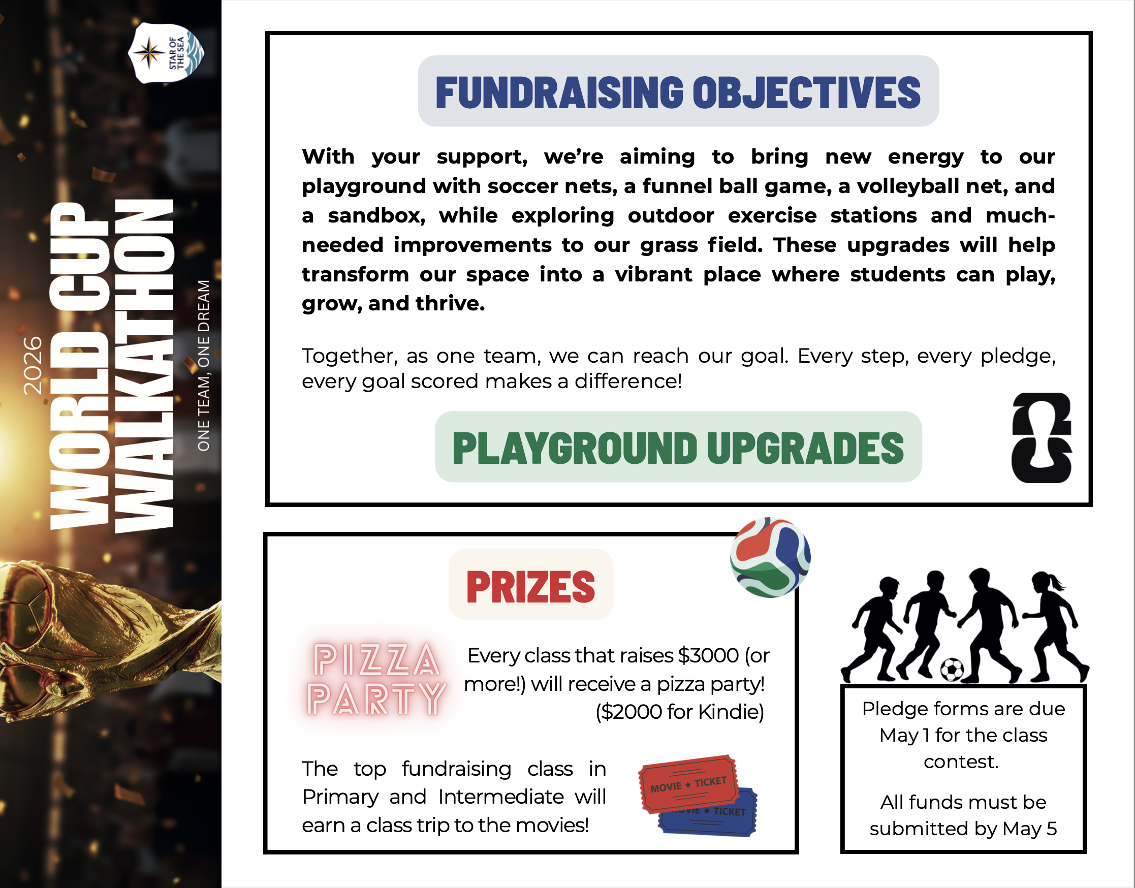 Our annual Walkathon is back, and this year we’re bringing the excitement of the World Cup to our school community! Students will “take to the field” as they walk, lap by lap, working together toward a shared goal of enhancing our outdoor play spaces and supporting meaningful causes.