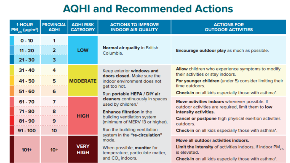Local wildfires have reduced air quality in our region. At Star of the Sea School, we follow the guidance of Fraser Health to determine when it is safe for children to be outdoors. We also use the Air Quality Health Index (AQHI) chart (see below) as a guideline.
