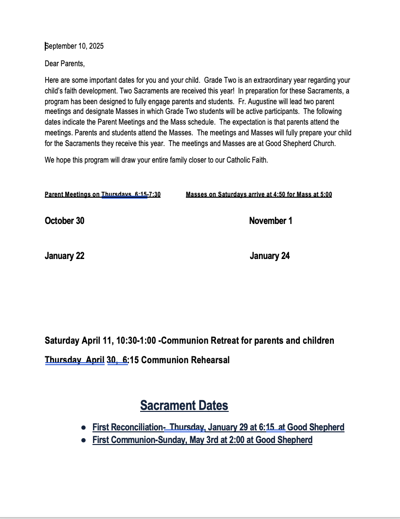 Dates of Meetings and Masses for children receiving their Sacraments. If you are interested in having your child be baptized, Mr. Borkowski will send an email to families on what steps to take.