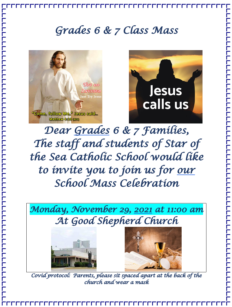 As an added Covid precaution, we are not having any school-wide Masses for now. Instead, we will be having smaller Masses involving only 4 classes at a time. Each class will sit in their own section of the Church. Parents are welcome to join us, following all necessary copied protocols for the church. Your invitation and a reminder about food bank items is below.