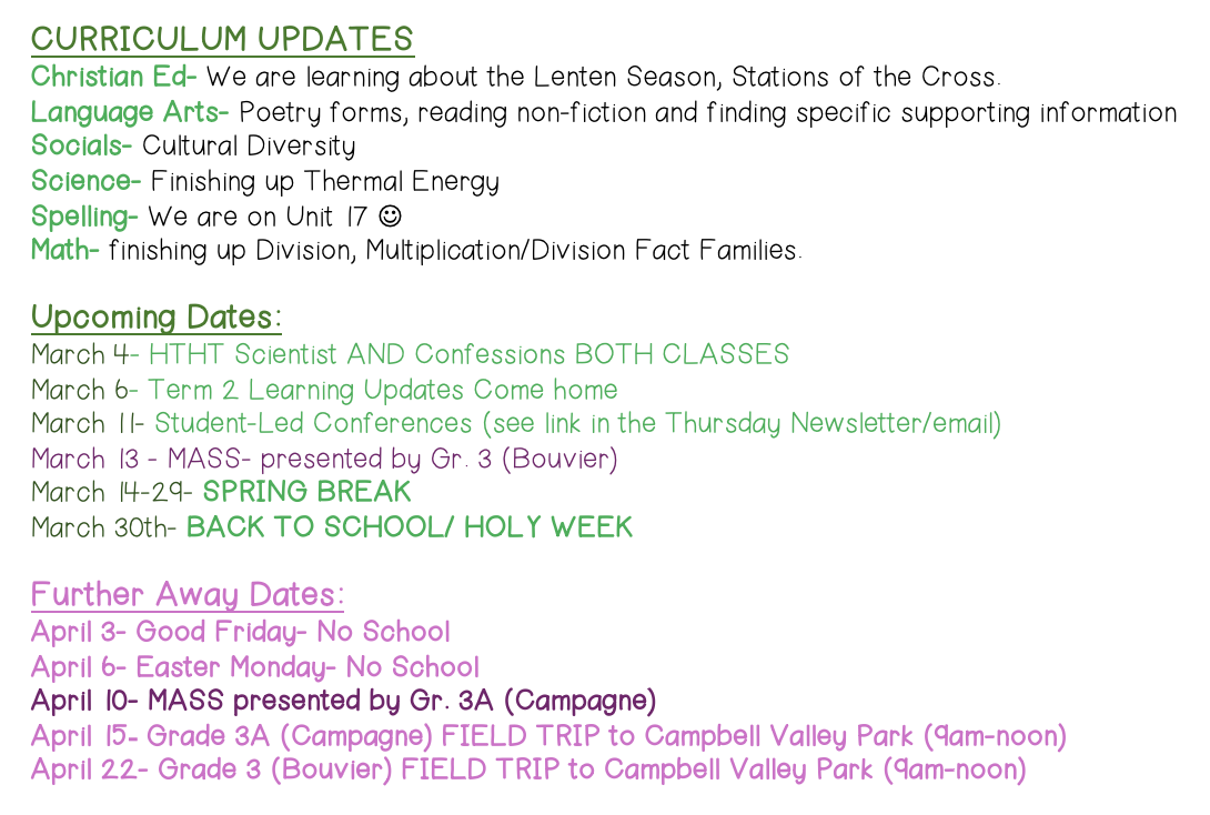 Gr. 3 March 2026 Newsletter We are certainly MARCHING into Spring quickly!Click HERE to see our latest news! Grade 3, Grade 3AAngela BouvierFebruary 27, 2026Gr 3 News- March, 2025-2026 Facebook0 0 Likes