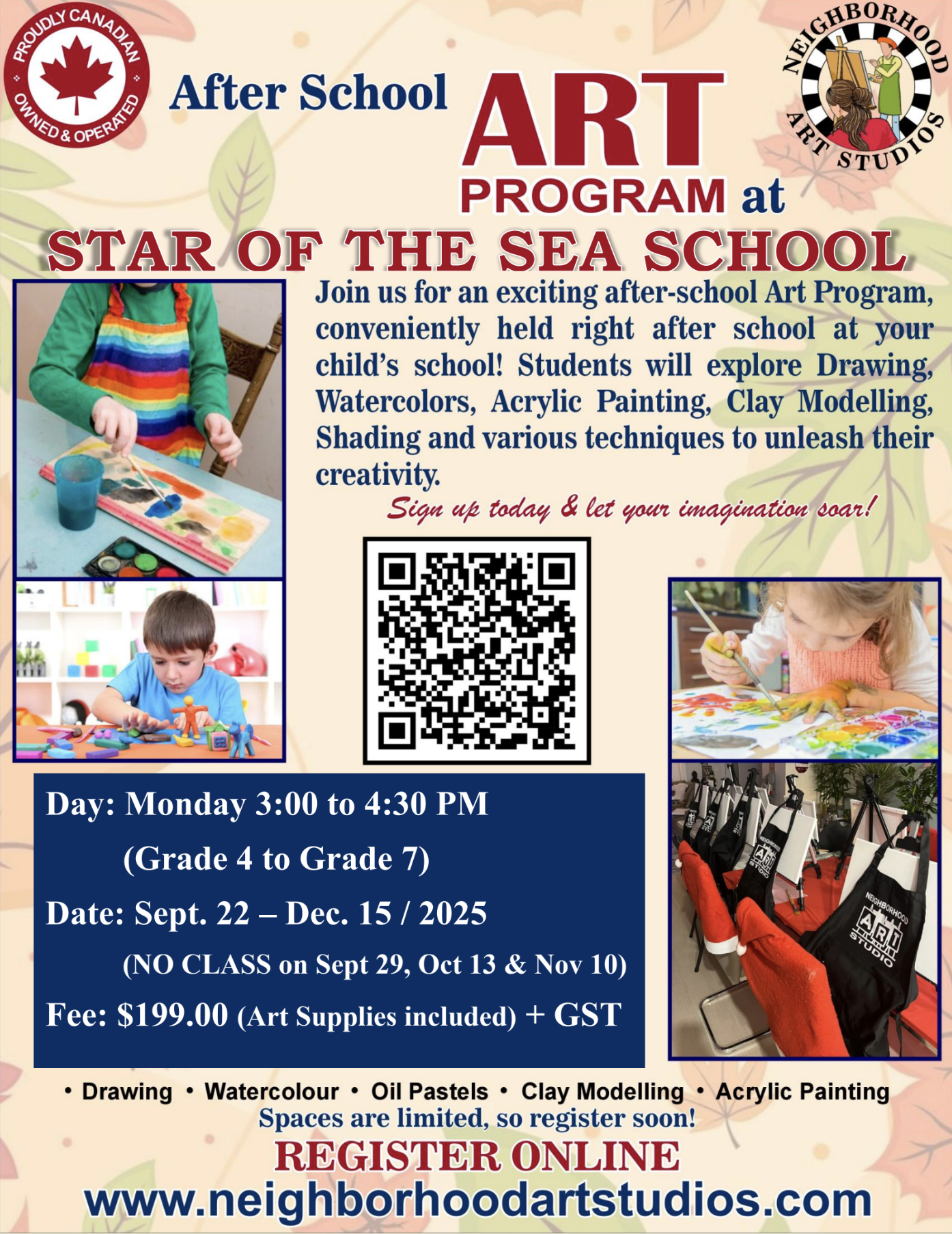 We are hosting, for the first time, Neighbourhood Art Studios (NAS). This is a local business in our community that offers art classes to students. The classes will be run and supervised by NAS employees. It is available to students in Grades 4-7. Students in Grades 2 & 3 will have an opportunity to join our school Art Club in the Spring.